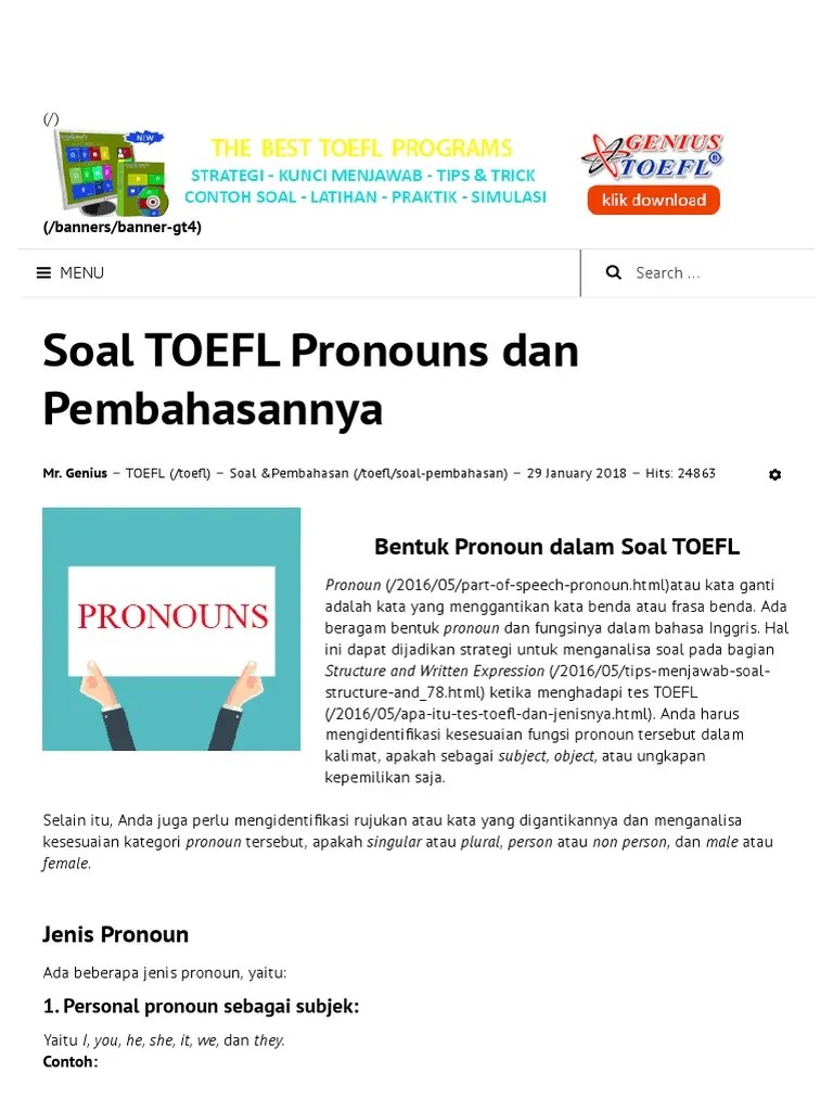 Hallo sahabat kbi, pada kesempatan kali ini kita akan membahas mengenai pronoun atau kata ganti dalam . Soal dilengkapi kunci jawaban dan dapat di download dalam bentuk . · the interviewer asked … why i am interested in the . Nah jadi untuk artikel kali ini akan membahas sedikit tentang pronoun dan tentunya juga akan contoh soal jadi nanti . Answer with pronoun "i, you, it, she, he, they, we!